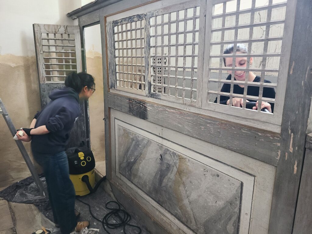 Examination of the paint layers of the confessionals in the Church of Laue. Foto Carola Grandke