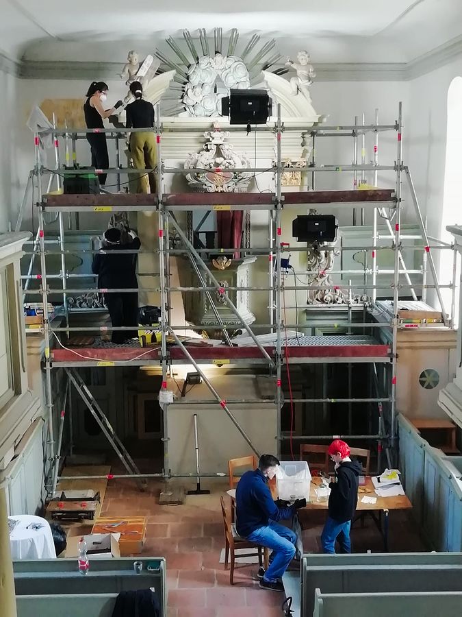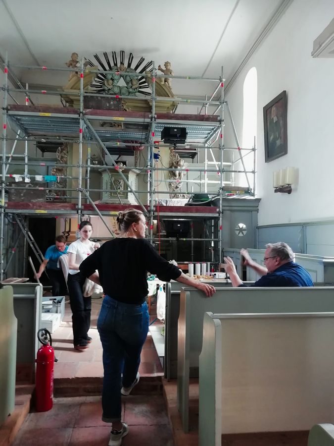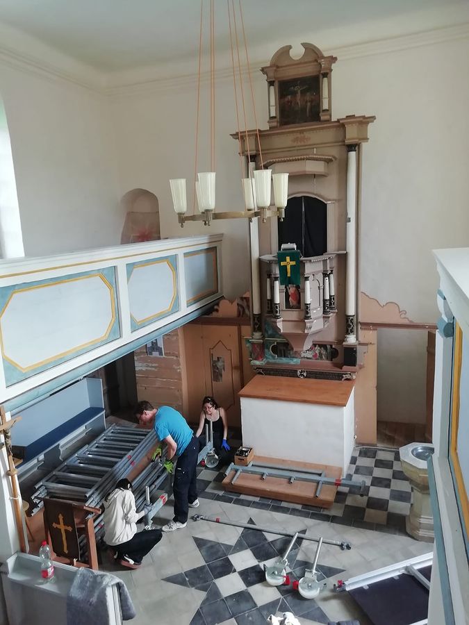 Four students from international universities will be given the opportunity to deepen and expand the theoretical knowledge they have acquired at the universities through practical work on objects of the interior in the three baroque churches. Over the course of four weeks, the pulpit altar in Spröda will be treated, the original Baroque paintwork of the confessionals in the church in Laue will be stabilised, and a panel painting on the altar of the church in Sausedlitz will be restored.