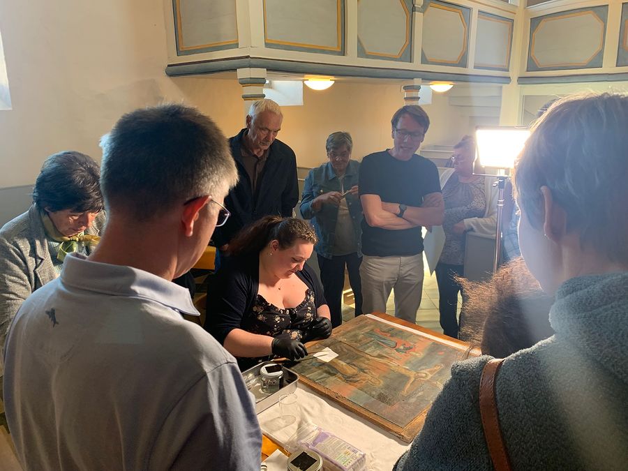 Evening workshop with the parish of Sausedlitz. The conservation of the Baroque panel painting was explained. Foto Carola Grandke